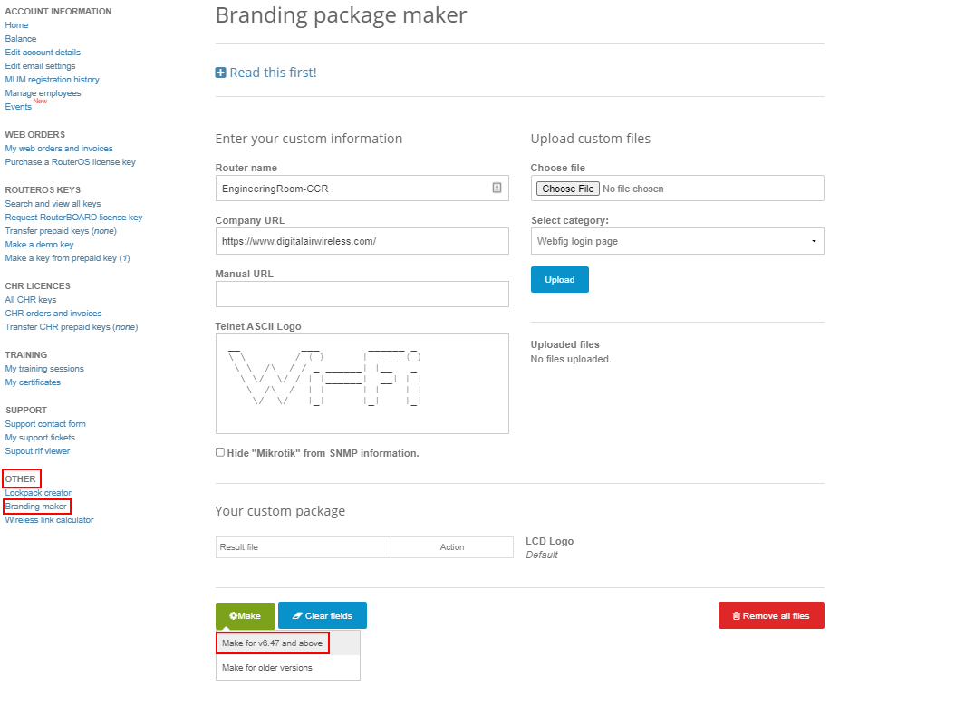 Enter a Router Name, Company URL, Manual URL and Telnet ASCII Logo. Click Make once you are happy. You will then need to make for either version 6.47 and above or make for an older version.