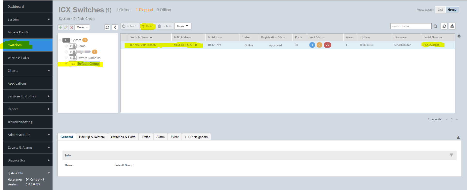 Log in to the SZ and go to: Switches > Default Group (Staging Zone), highlight the device, and move to the required switch group. The switch will appear in the group as offline until approved. check the MAC address to ensure you have the correct switch.