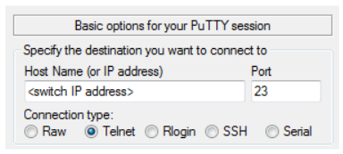 Start by powering up the switch, and connect a serial cable to the console port on the switch. Once this connection has been made to the switch, a command-line interface (CLI) session can be initiated via a terminal emulation program such as PuTTY (www.putty.org). When PuTTY is started, use the following settings depending on whether you are connecting via Telnet or a serial interface: