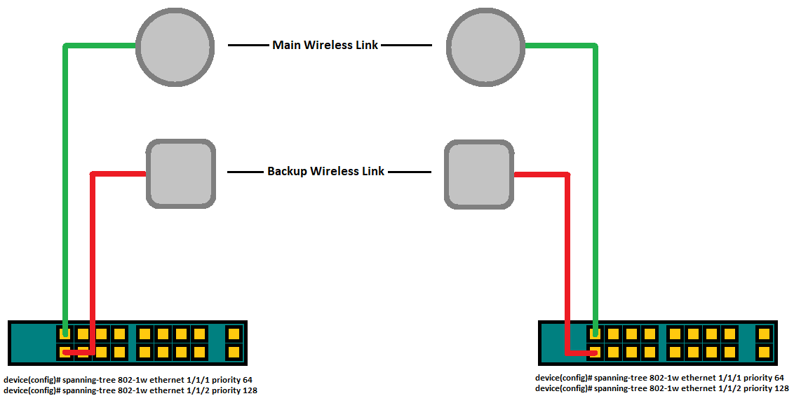 With this setup both primary ports will be functioning in a forwarding state. Dynamically, one of the backup ports will also be running in a forwarding state while the opposite end will be running in a discarding state to prevent a loop. Should the main wireless link disconnect or one of the heads power down, both backup ports will resume a forwarding state.