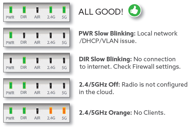 If wireless devices that are connected to your APs are experiencing connectivity issues, check the AP LEDs to determine if your APs are operating normally.