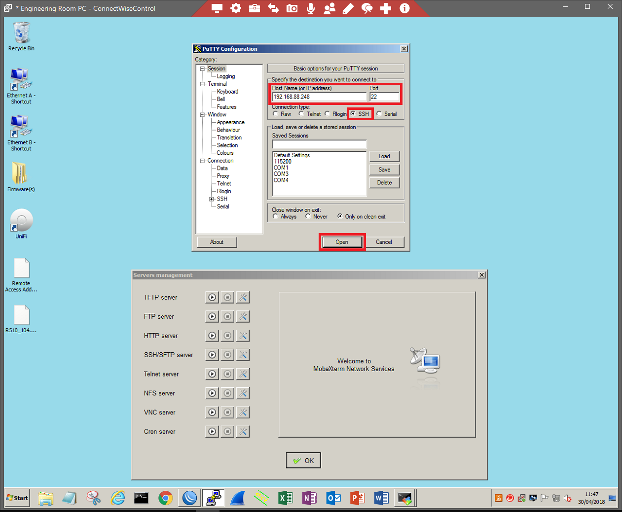 SSH into the AP using Putty. Use the IP address of the Access Point in the 'Hostname (or IP address)' section. Ensure that you are using port 22 and that SSH is selected. Click 'Open' to begin the connection.